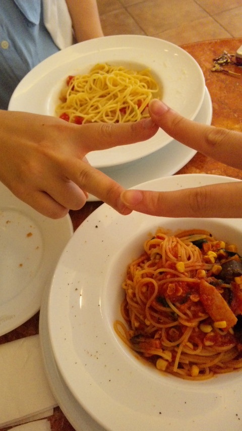 私がとうもろこしと茄子のトマトソースパスタ。