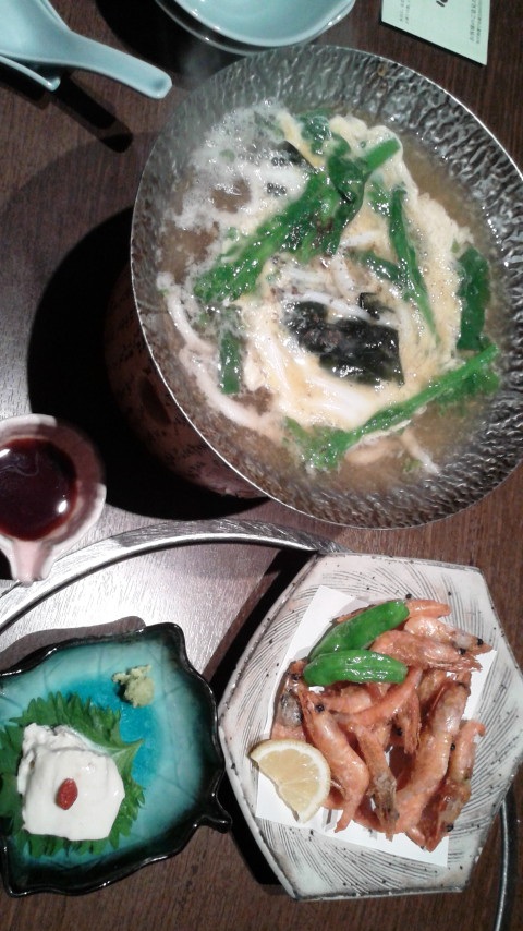 菜の花と白魚の卵とじ、甘海老の天ぷら、とろ湯葉のお造り!